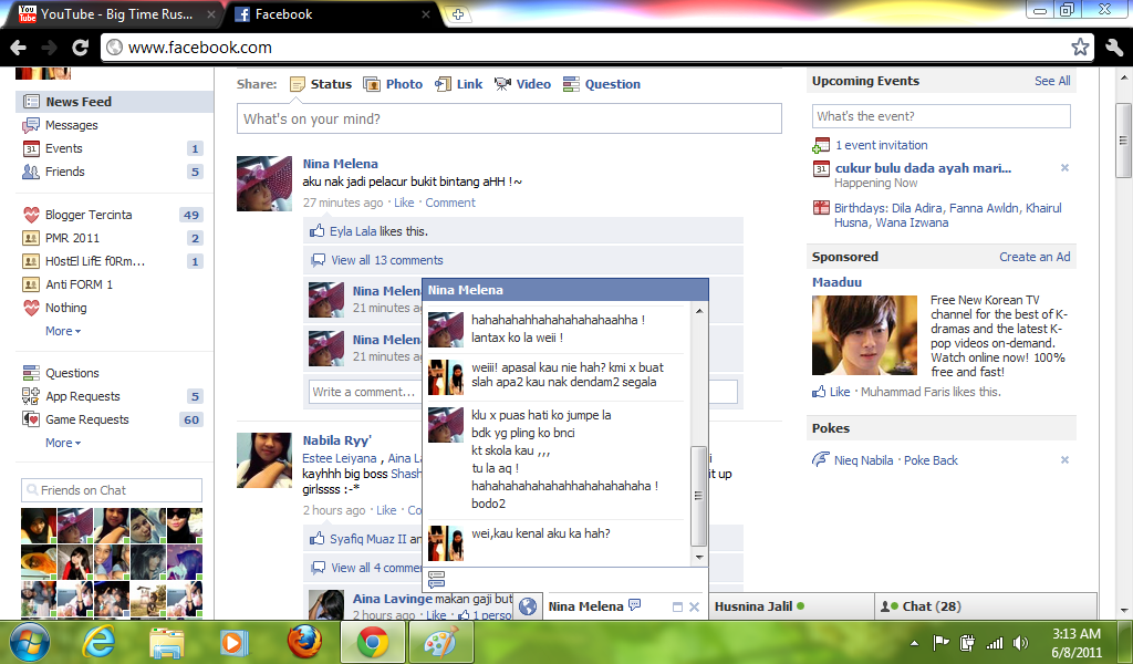 Maaf la wahai readers.FYI (For your information) salah sorang daripada junior yang aku rapat kena hack fb dia sehari yang lepas.Kesian kan? Hacker yang hack fb dia sangat-sangat la teruk.Sekali aku pun kena sebab kebetulan aku online and then hacker tu chat dengan aku.Nak tengok dia cakap apa? Tengok dekat bawah okay.I just want a normal life back.Please people.And dont ever disturb me and Nina Melena again.Cukupla apa yang Nina rasa.Please stop it fellas! Ok,that all for today.My mood is not really good right now.So,goodnite fellas. *It is not in right order.Baca jea okay.